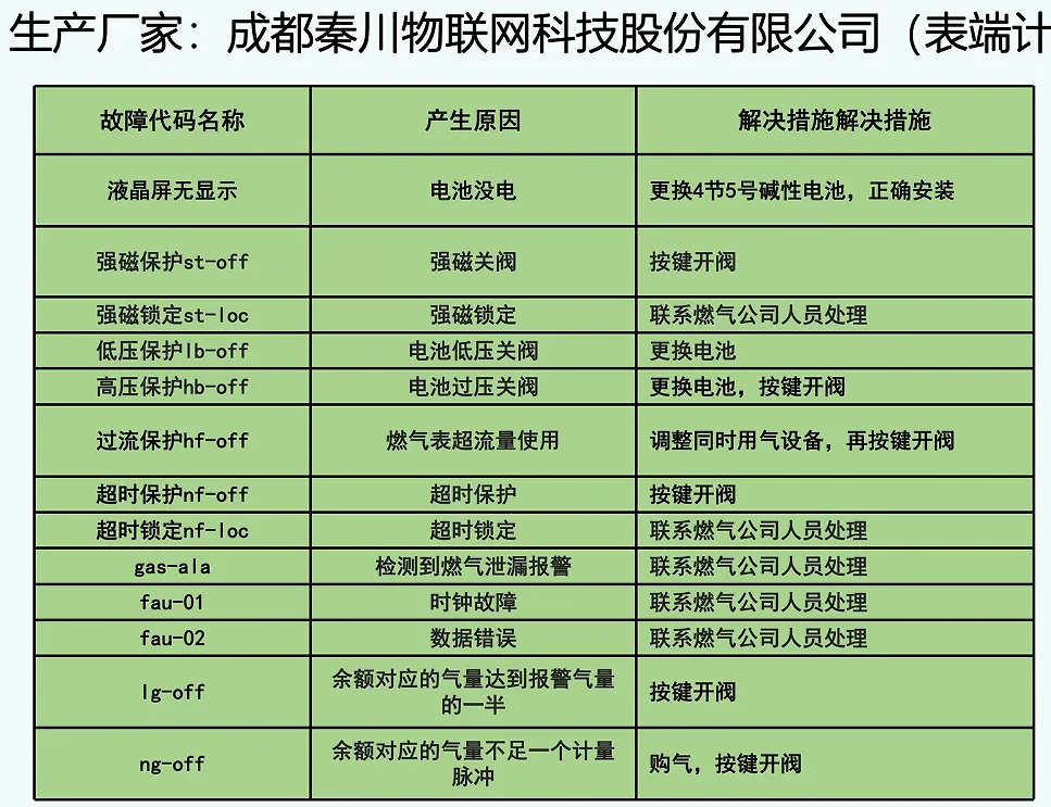 >快速识别解决燃气表故障代码(厂商:成都秦川表端计费)