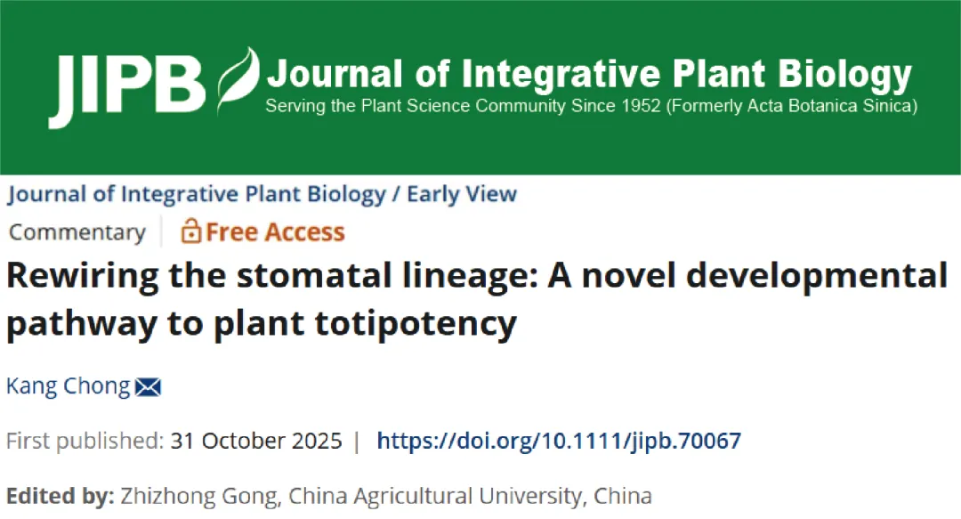 Chong, K. (2025). Rewiring the stomatal lineage: A novel developmental pathway to plant totipotency. J. Integr. Plant Biol. https://doi.org/10.1111/jipb.70067JIPB面向全球,刊发整合植物生物学研究的重要创新成果,包括宏观和微观领域有创新性的重要研究论文、综述、简讯、新资源、新技术和评论性文章等。2024年2年SCI_IF:9.3,5年SCI_IF: 10.8,位于植物科学TOP 3.1%,SCI的Q1区。2024年Scopus数据库中CiteScore: 19.1,位于植物科学TOP 2%。JIPB位于中国科学院期刊分区生物学大类1区和植物学小类1区,中国科协《植物科学领域高质量期刊分级目录》T1级,获得由科技部等七部门联合实施的“中国科技期刊卓越行动计划”资助 (2019–2028)。