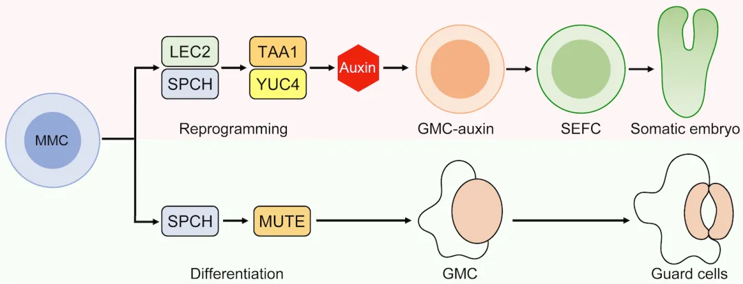 较动物细胞而言,植物细胞具有更强的发育可塑性,在一定条件下,它们无需受精就能发育成胚胎,这种现象被称为“体细胞胚胎发生”。植物细胞还有着独特的“再生”能力,例如,叶片等任意一种植物的体细胞在经历重编程后,能够回归到原始的干细胞状态,并进一步进入“体细胞胚胎发生”阶段,最终再生为一株完整的植株。这一“再生”现象在快繁、生物技术育种、脱毒培养等农业生产中具有极为重要的应用价值。近日,中国科学院植物研究所种康院士在JIPB上发表了题为“Rewiring the stomatal lineage: A novel developmental pathway to plant totipotency”的评述文章 (https://doi.org/10.1111/jipb.70067),对山东农业大学张宪省、苏英华教授团队近期发表在《Cell》的研究成果“Time-Resolved Reprogramming of Single Somatic Cells into Totipotent States during Plant Regeneration”进行了深入评述。该评述认为,植物体细胞胚胎发生 (somatic embryogenesis,SE) 这一神奇的再生过程,其研究又获得了重要推进。在他们的研究中,借助精细的影像技术、谱系追踪和单细胞转录组学分析,首次揭示了源自特定表皮细胞类型的直接体细胞胚胎发生,成功实现了不经过愈伤组织的体细胞胚胎发生。这一发现不仅揭示了植物全能干细胞的来源,还解开了正常气孔发育与胚胎发生重编程之间的复杂分歧。研究表明,气孔谱系中的拟分生母细胞 (meristemoid mother cells,MMCs) 能够直接启动体细胞胚胎发生程序。这个过程的核心调控因子是LEC2,它通过激活局部的生长素合成途径,决定细胞的命运转变:要么进入气孔拟分生母细胞命运,完成气孔分化;要么转化为全能干细胞,启动胚胎发生 (图1)。这一发现为植物细胞全能性提供了全新的视角,并揭示了生长素合成在这一过程中的关键作用。