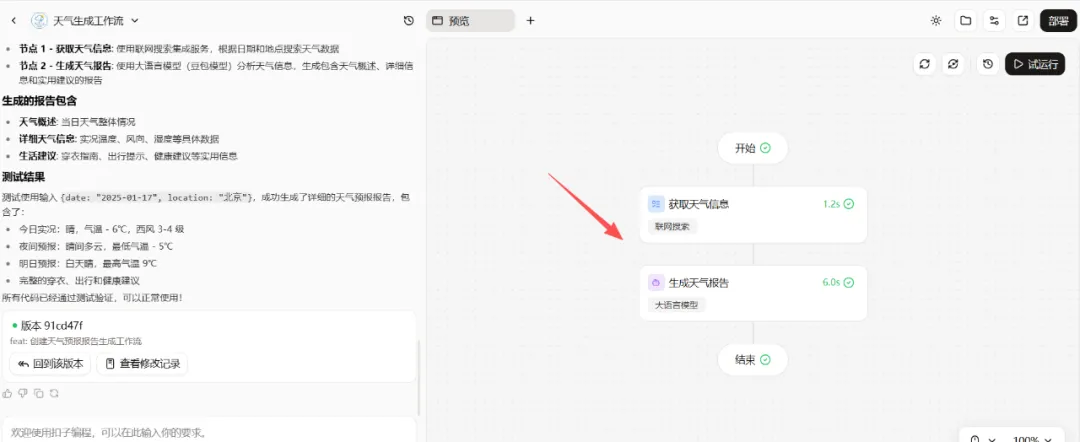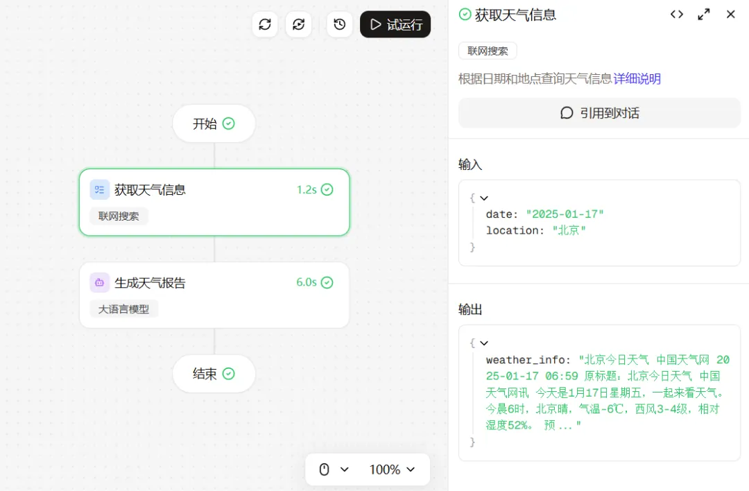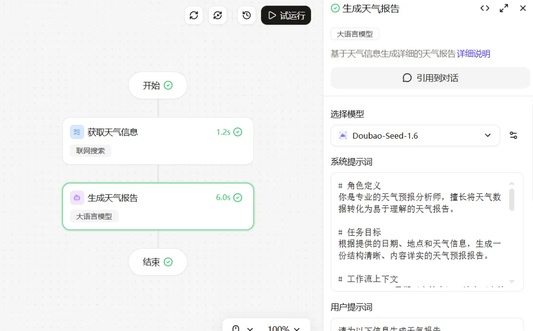 然后就等待它去生成,稍等一会,页面上就出现了完整的工作流:开始→天气数据获取→天气预报报告生成→结束。