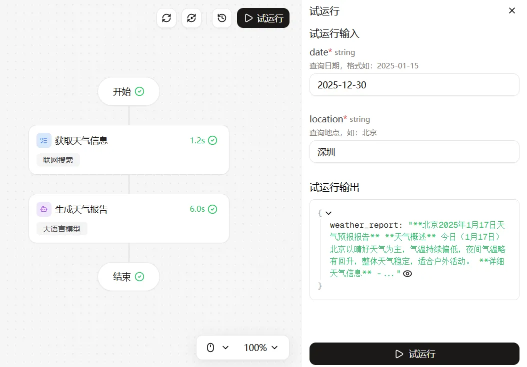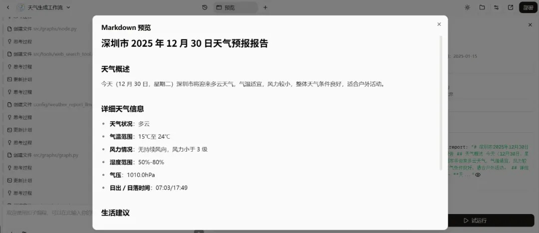 接着我们来试运行下,点击右下角的 “试运行” 按钮,输入日期 “2025.12.30”、地点 “深圳”,等待一会,它就会给你生成一份详细的天气预报!