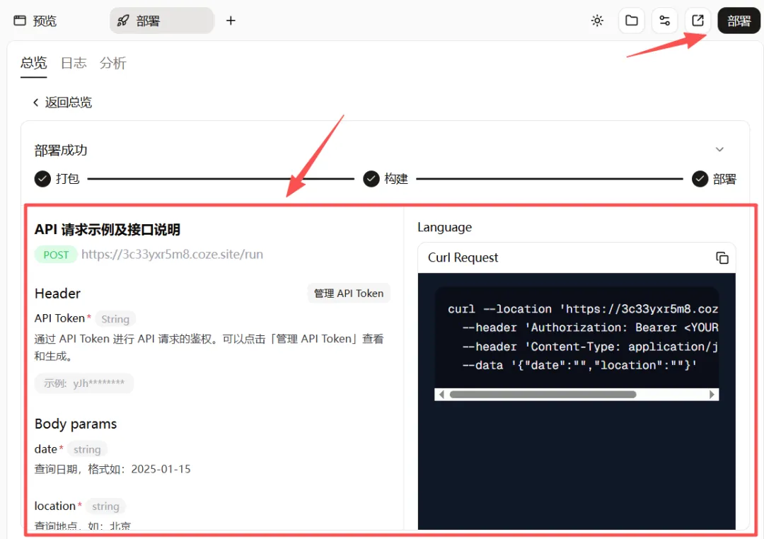 没什么问题后,我们就可以去部署下,点击右上方的“部署”按钮,这个工作流就会开始打包、构建、部署,最后会生成一个可直接访问域名,只需要发送对应的请求就可以触发工作流的运行。