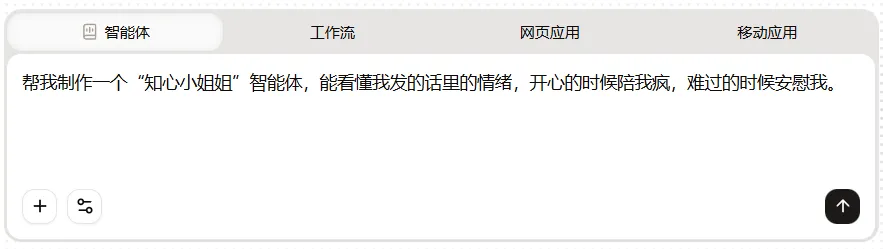 还是跟上面一样的操作,打开扣子编程,选“智能体”,输入需求:帮我制作一个“知心小姐姐”智能体,能看懂我发的话里的情绪,开心的时候陪我疯,难过的时候安慰我。