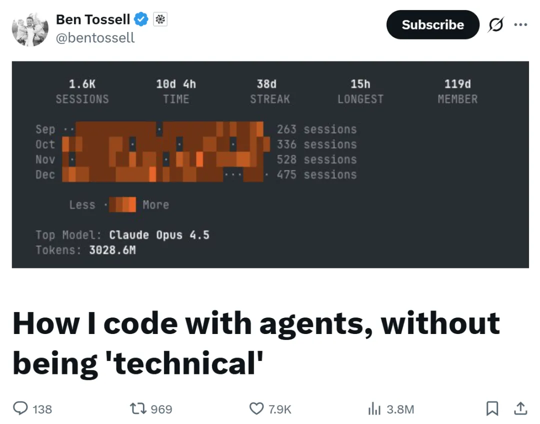 Ben Tossell,Factory 开发者关系主管、前 No-Code 创业者,在最近的一次推文中表示:过去 4 个月,他通过终端与 AI Agent 协作,累计消耗了约 30 亿个 token,完成了数十个真实项目的开发与上线。