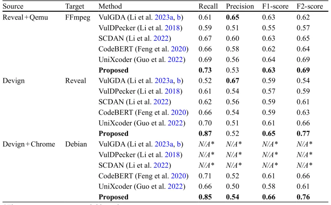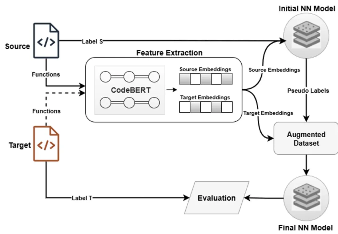 小结:ZSVulD使用冻结的CodeBERT嵌入来提取源代码的领域无关表示,同时捕获语法和语义信息。这些嵌入通过一种迭代伪标注机制进行处理,在多次迭代中为目标样本分配并细化标签。实证评估表明,ZSVulD在多个跨项目设置中实现了高召回率。