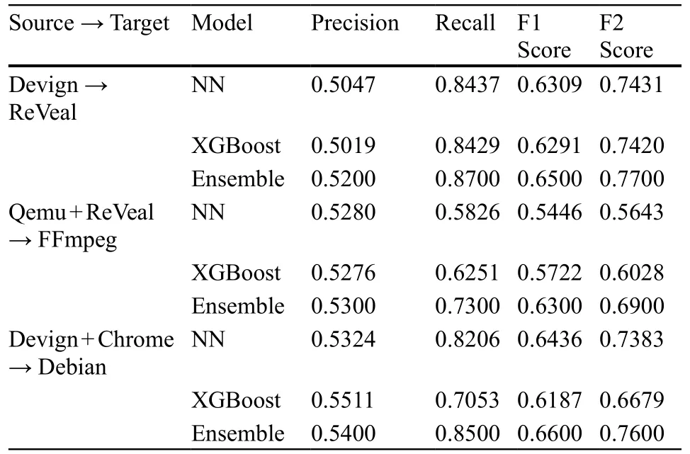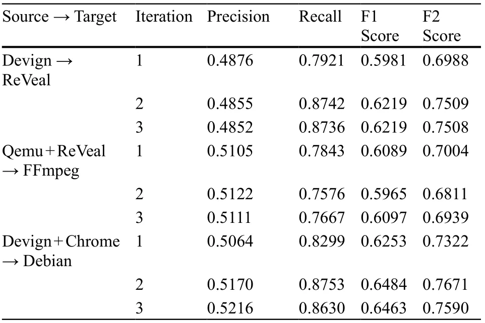 (1)实验评估了迭代伪标注在跨项目漏洞检测中的影响,结果如表1所示。表1. 迭代伪标注的效果