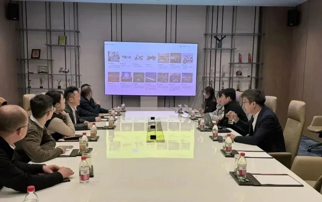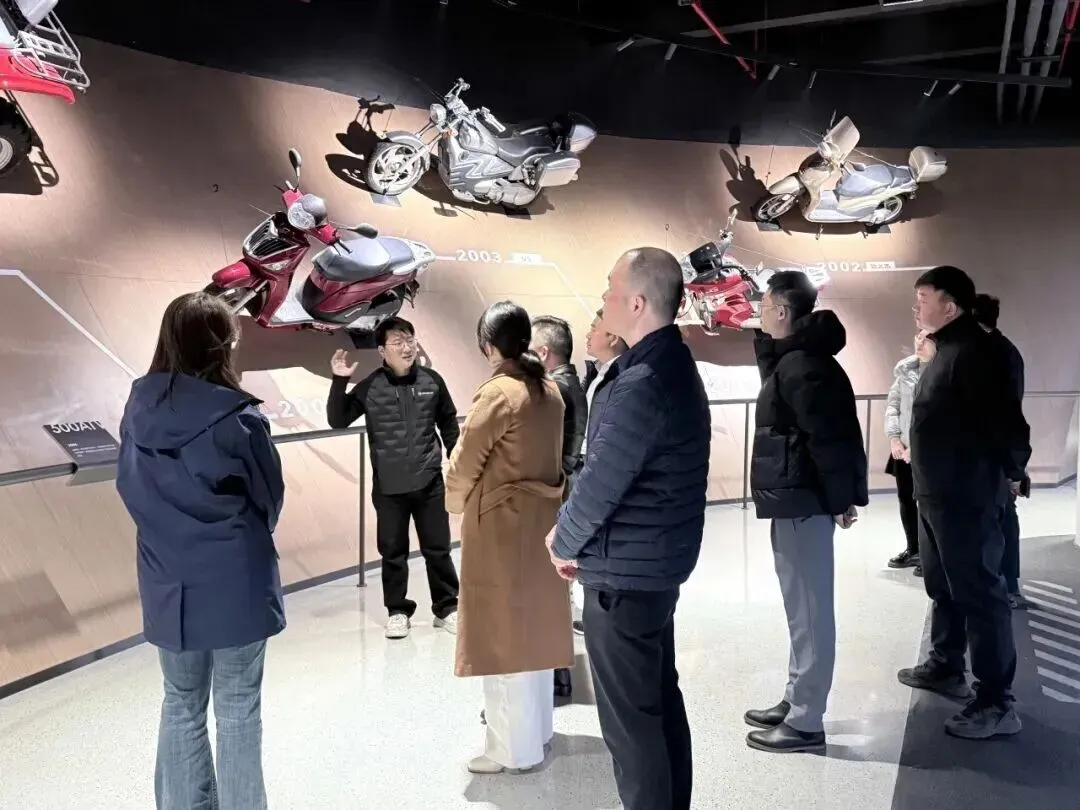 在周雄秀副总经理的讲解下,盛海峰董事长与参访团一行深入春风动力企业展厅,系统了解公司35年来自主研发、品牌升级与全球拓展的历程。从大排量摩托车、全地形车到电动两轮车,从“发动机—电控—车联网”全栈自研技术到覆盖100多个国家的销售网络,春风动力展现出的“硬核科技力”与“全球运营力”令参访嘉宾深受启发。