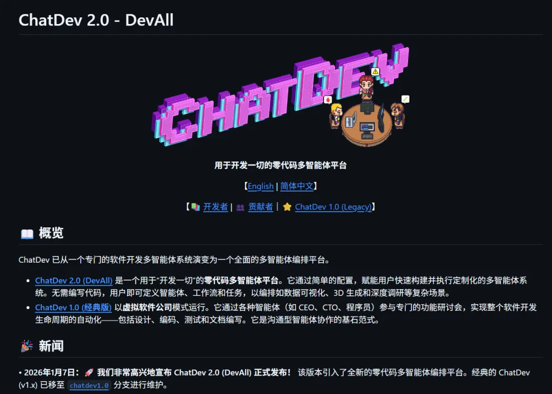 在多智能体协作这个越来越火的赛道里,总能挖到一些让人眼前一亮的开源项目。今天要给大家推荐的,就是由清华大学NLP实验室支持的ChatDev,尤其是它最近发布的2.0版本(DevAll),把多智能体系统的搭建门槛又拉低。