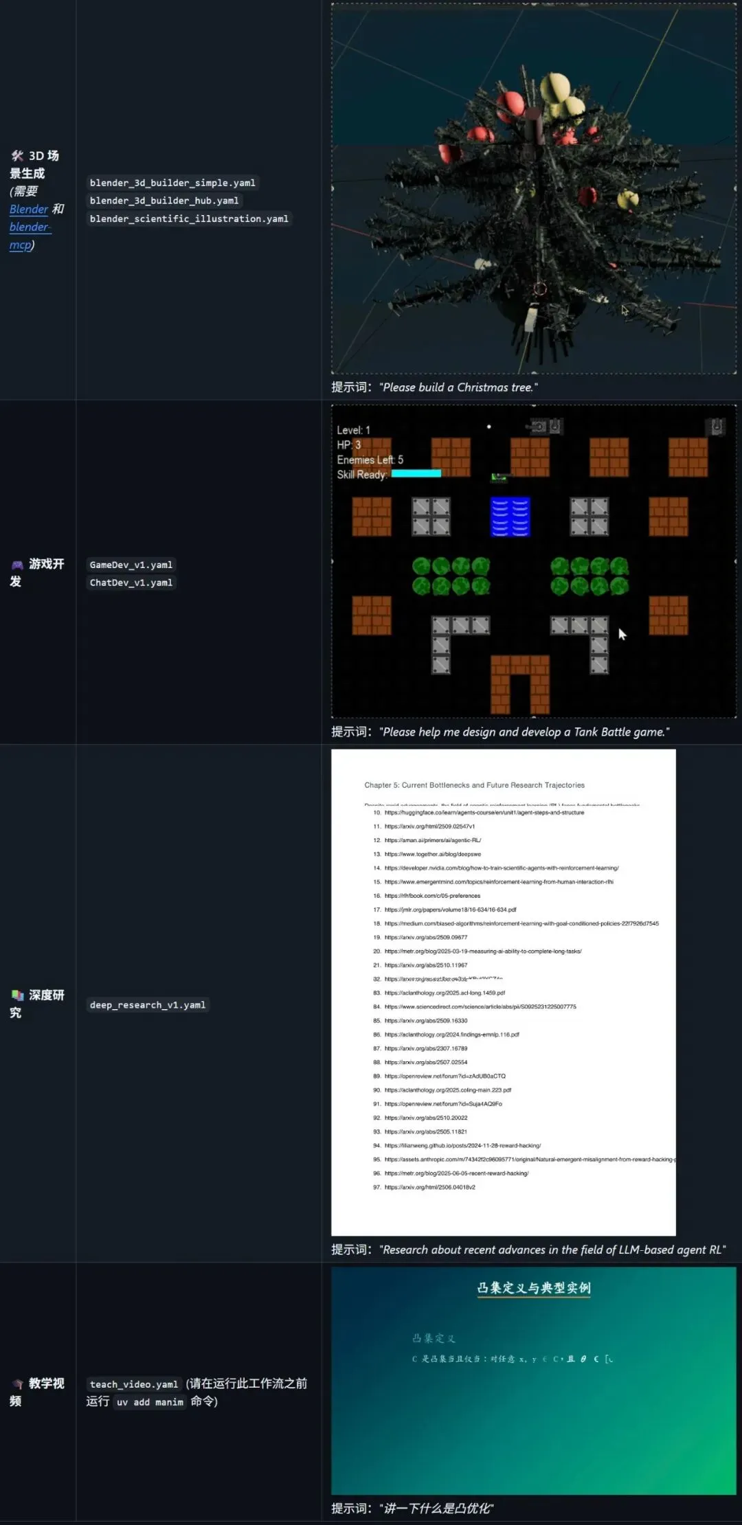 还有下面一些关于 3D 场景生成、游戏开发、深度研究、教学视频等模板
