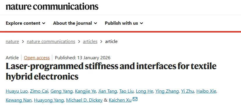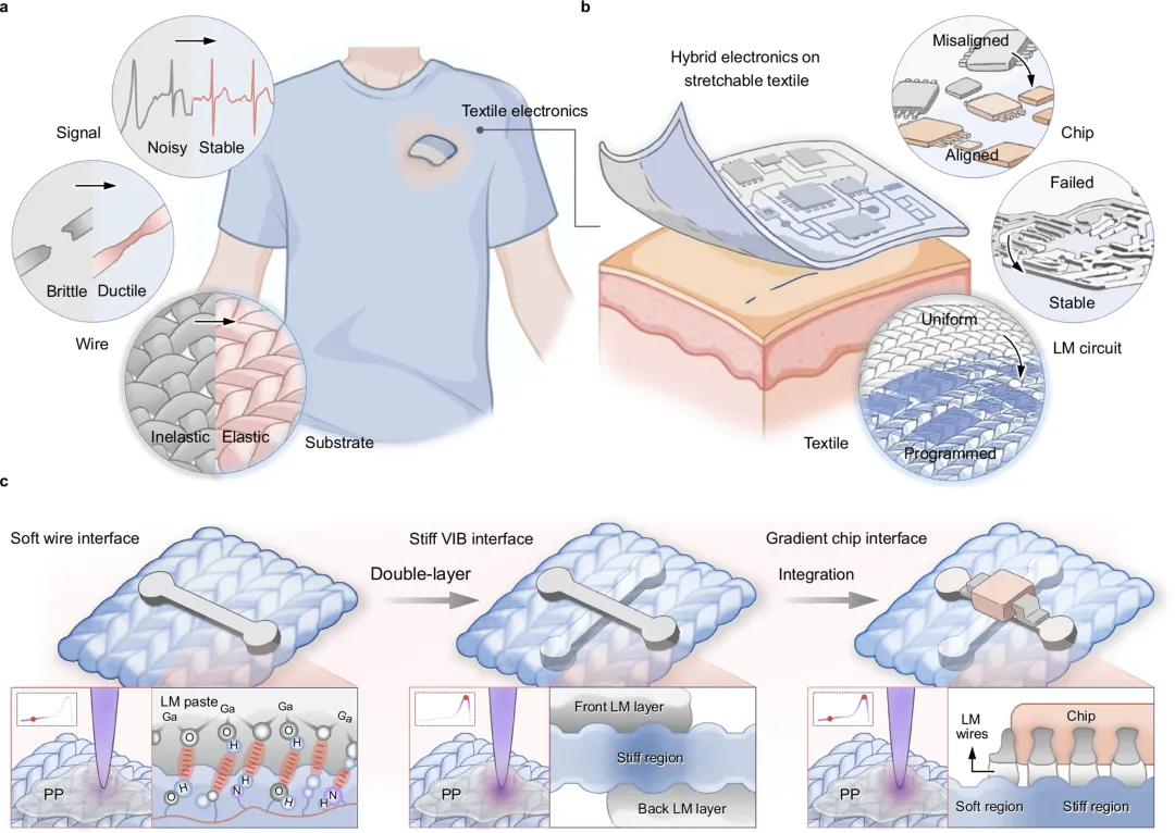 纺织电子、可拉伸电子、激光编程、梯度刚度、液态金属、混合电子、界面工程