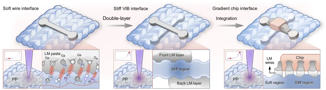 创新点: 提出了基于激光调控PP聚合的单步、无掩模、可编程梯度刚度纺织基底(LPT),同时优化了芯片-纺织、导线-纺织、层间绝缘等多个异质界面,设计理念系统且通用性强;