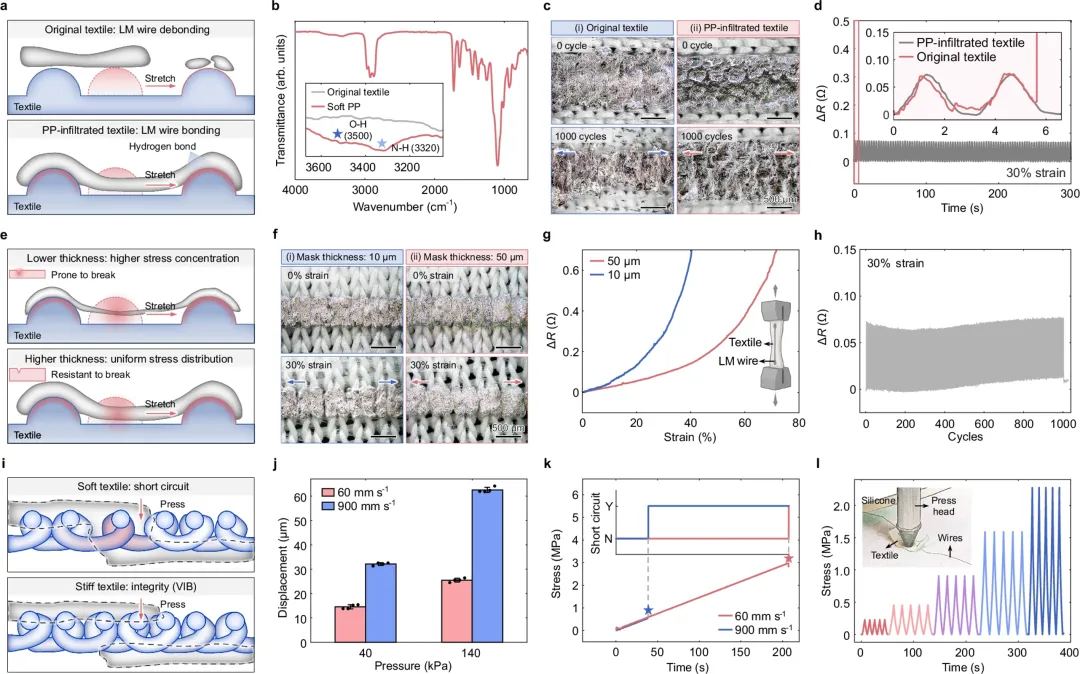 i 示意图显示,由刚度编程形成的垂直互连块(VIB)可防止纺织品两侧LM导线之间发生短路。相比之下,柔软纺织品在压缩应变下会产生垂直间隙,导致层间短路。VIB:垂直互连块。