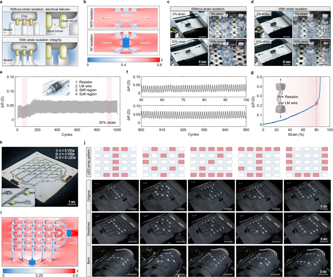 实现了一个5×5发光二极管阵列显示屏和一个可穿戴无线健康监测贴片,在高达50%应变下稳定工作,验证了该方法在复杂动态环境下的实用性。