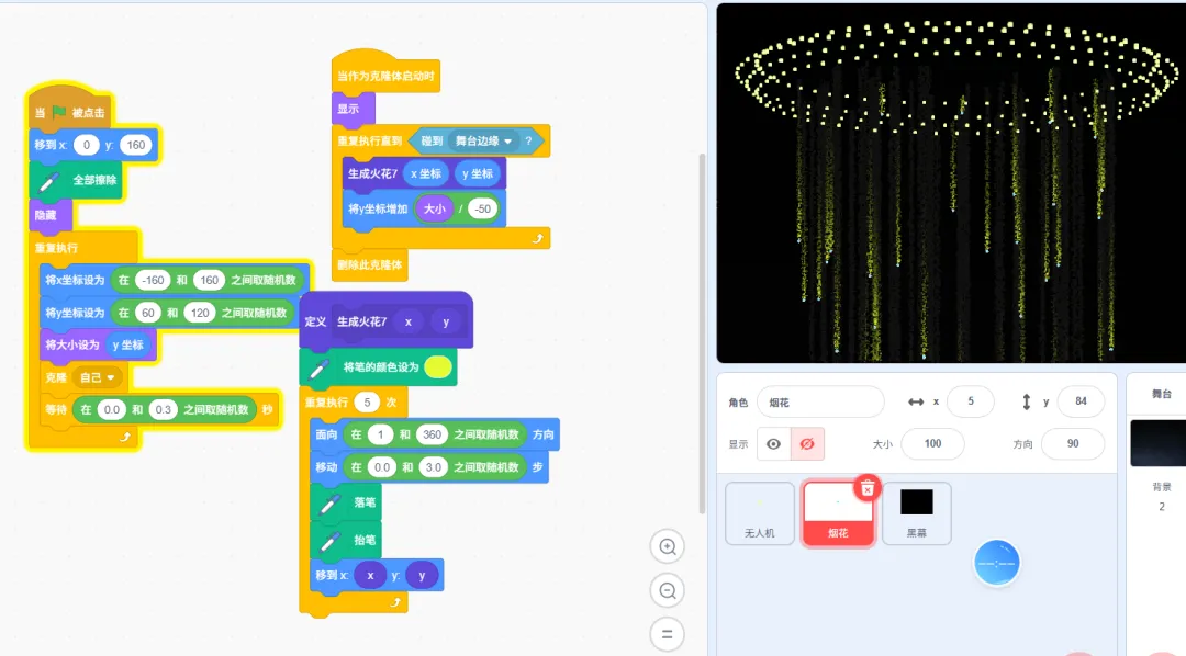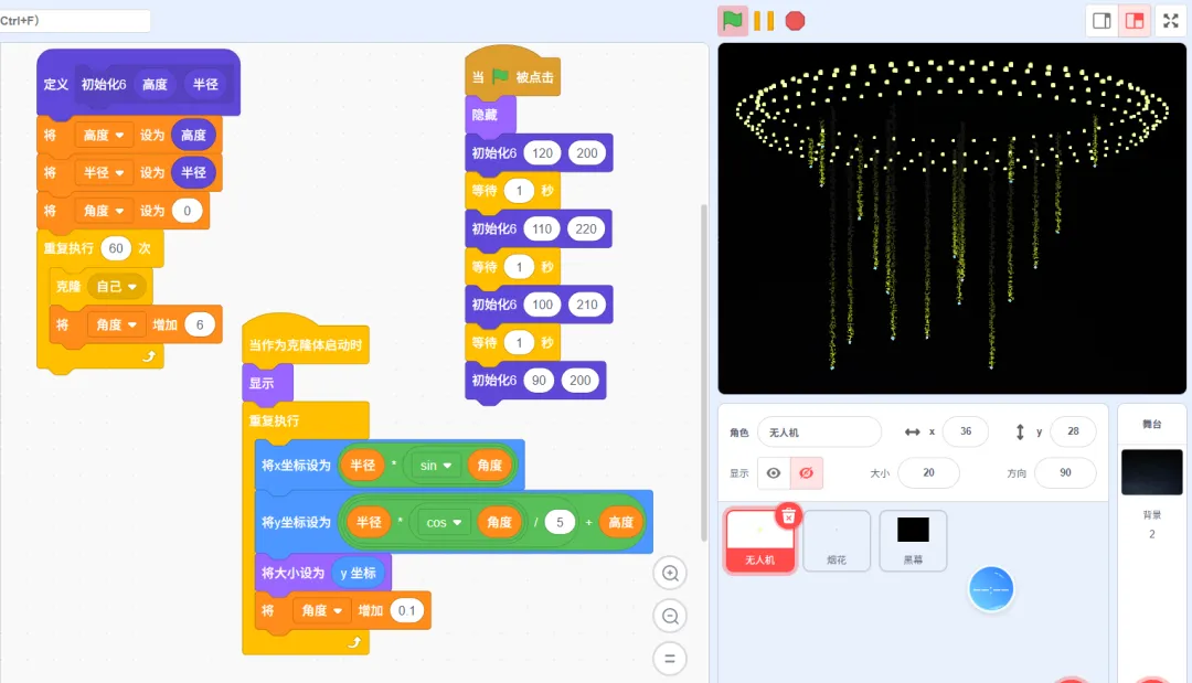 大家好,我是大炮老师!今天我们来更新一节Scratch课程--无人机烟花表演!本作品是学习羊小驼叔叔,这篇作品希望能帮助到大家!本作品源码已更新于源码在最后!请公众号会员直接去群里下载!