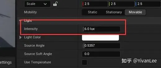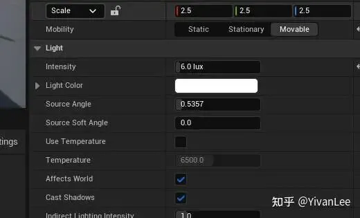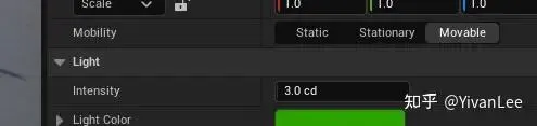 这是我们在UnrealEngine中的灯光面板,最基础的两个功能是Intensity和LightColor