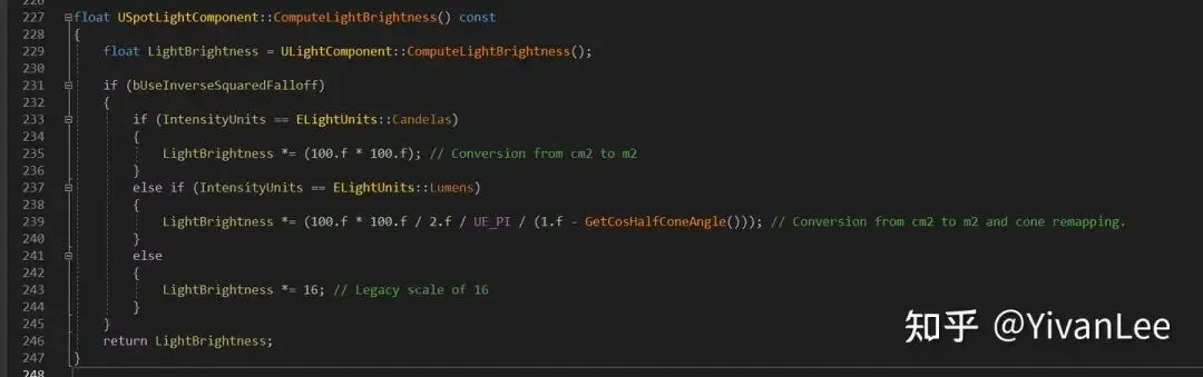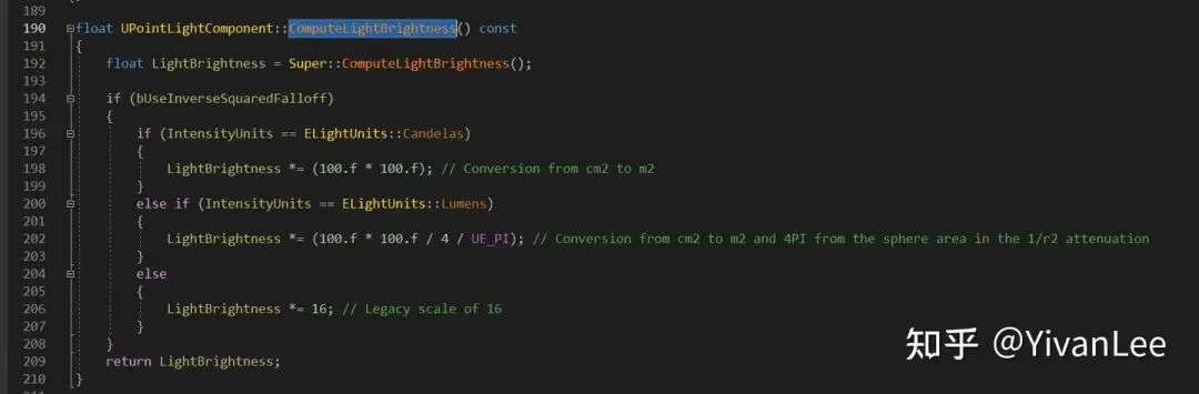 我们可以注意到方向光的单位和点光源或者聚光灯的单位是不同的,方向光的单位是lux,聚光灯的单位是cd我们可以在UPointLightComponent::ComputeLightBrightness()中找到答案。