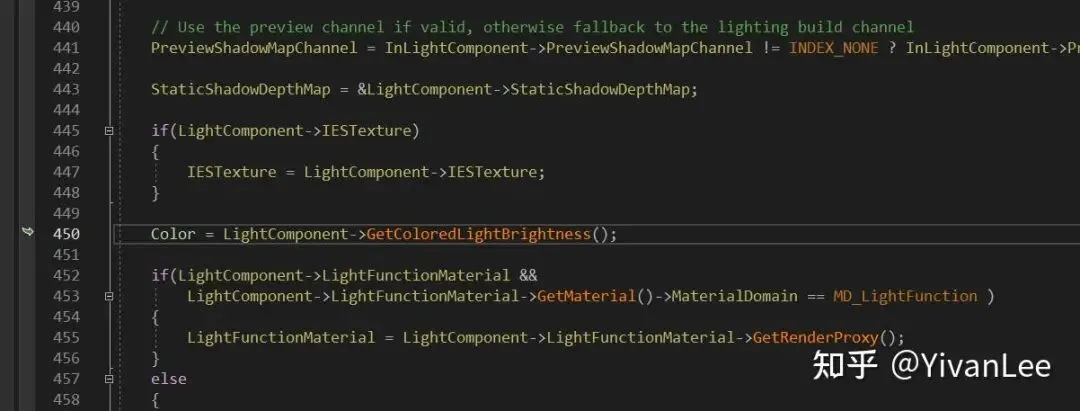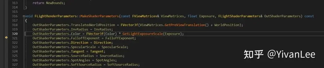 UnrealEngine内部首先会把Intensity和LightColor在CPU阶段就合并,合并计算非常简单,直接相乘就好了,最后在Shader里使用的LightColor是经过Intensity缩放的。但是这个数据缩放并不是简单的Color * Intensity,因为我们还要注意它们的单位