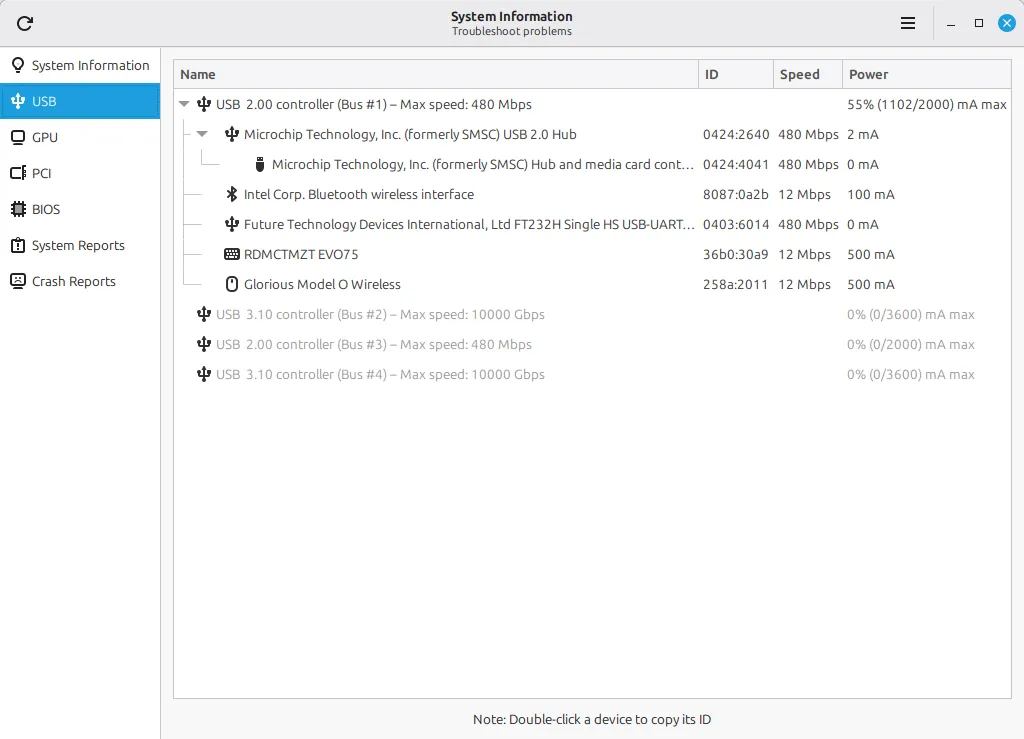 “USB”页面显示了所有插入设备的详细视图,包括它们的类型、名称和ID(ID,唯一标识设备及其制造商)。