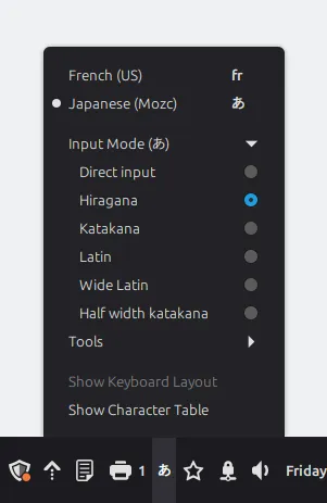 在这张截图中,你可以看到两个布局的列表。一种是传统的XKB布局:美国ANSI布局上的法国重音。另一种实际上是IBus输入法:日语,使用Mozc引擎。