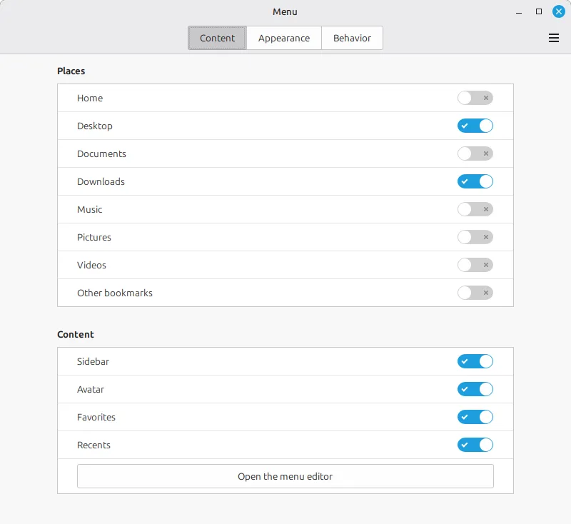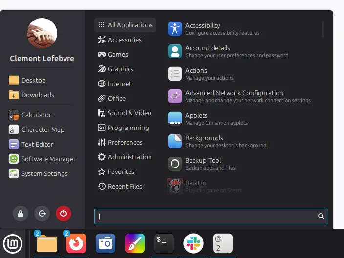 Cinnamon的应用菜单进行了重新设计并更换了布局。它有一个侧边栏,包含你的头像、地点和喜欢应用的各个部分。