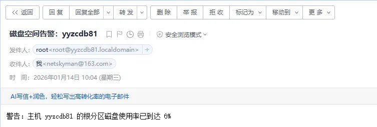 2026-01-14 10:44:08 - 警告:主机 [yyzcdb81] 的分区 [/] 使用率已触及 6%(阈值:5%)