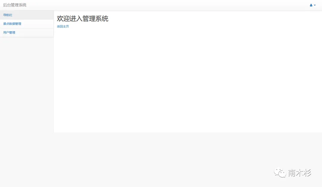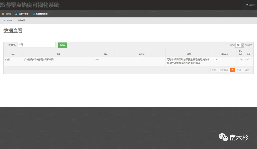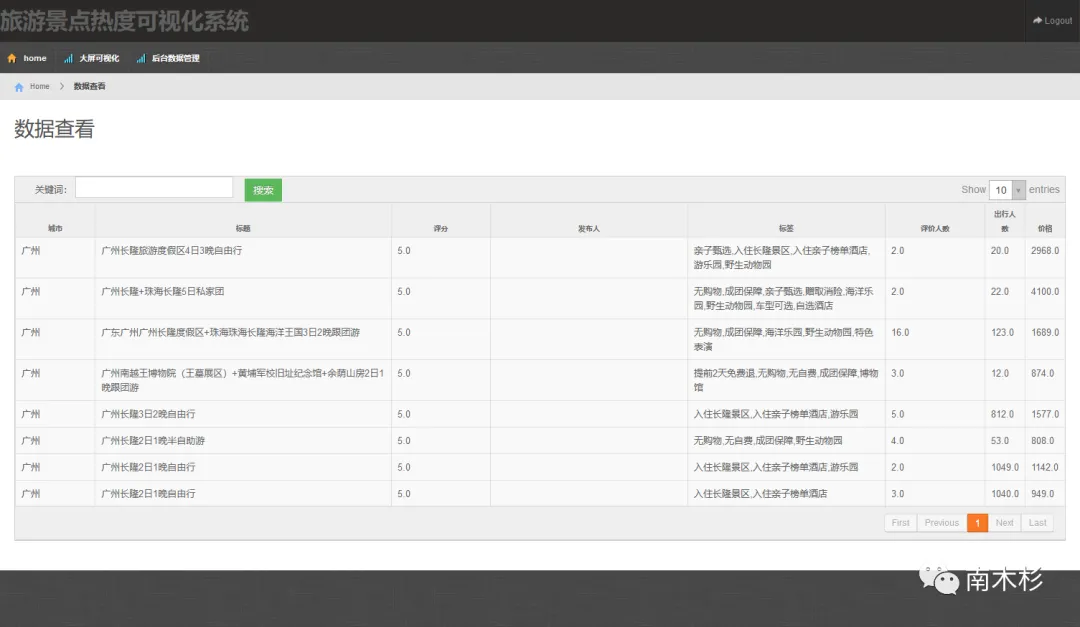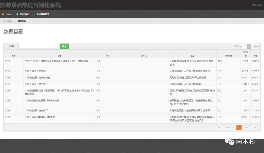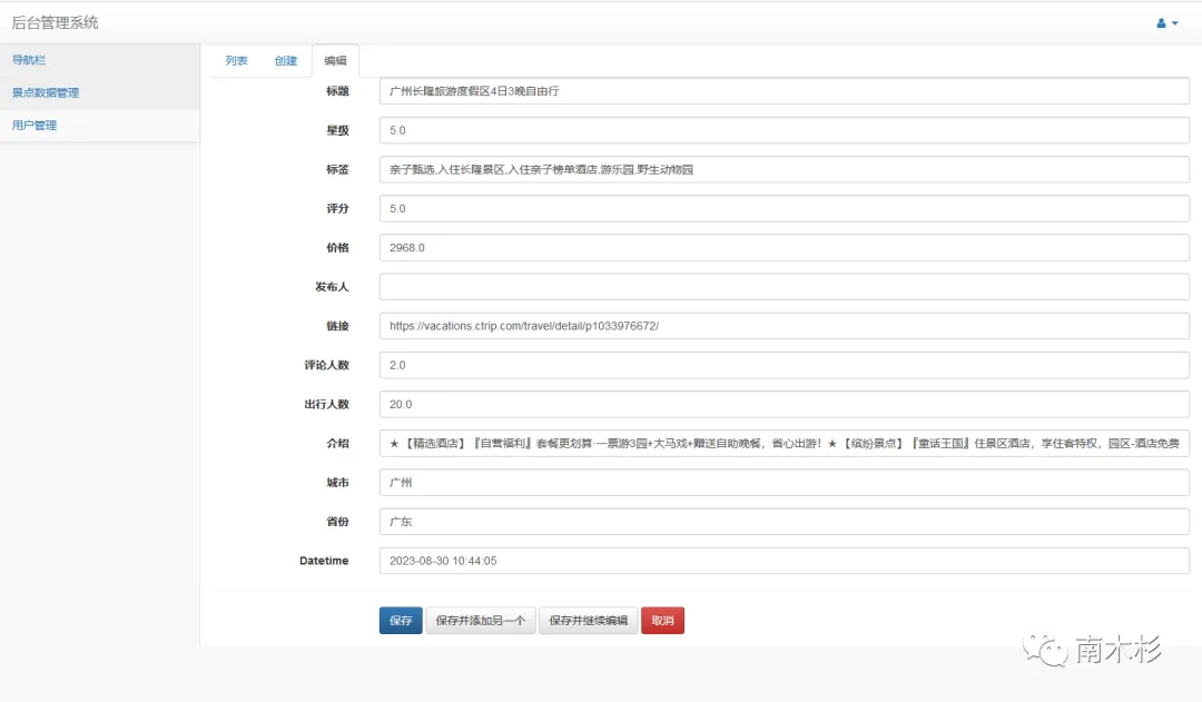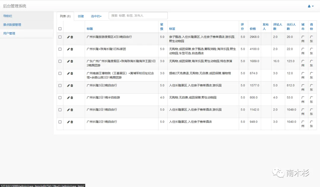 可视化“点击后台数据管理,进入数据库管理页面,对旅游景点数据进行管理,可执行删除修改等操作。