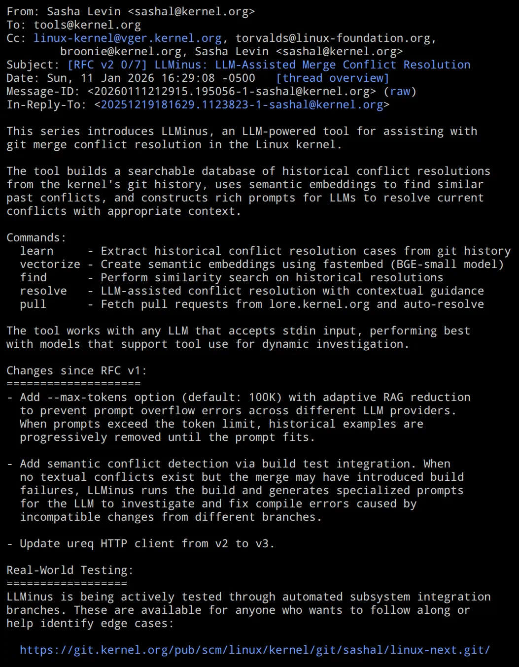🎮 Budgie 11 桌面环境正基于 Qt6 工具包进行开发 随着本周末Budgie 10.10版本的发布,Budgie桌面开发团队同步更新了Budgie 11桌面的开发进展。继Budgie 10.10实现从X11到Wayland的过渡后,Budgie 11现已进入开发阶段,并将采用Qt6工具包。开发团队正全面推进基于Qt6工具包的用户界面重构。除采用Qt6外,Budgie 11计划进行架构重塑,以提升模块化程度并实现全方位增强。新版桌面环境很可能将整合KDE框架及其丰富的辅助工具库集合。欲了解Budgie 11初步规划详情,可通过BuddiesOfBudgie.org发布的2025年度回顾与2026年展望报告获取更多信息。💾 Debian 13.3 发布,包含多项安全与错误修复 Debian 13.3 于今日发布,这是 Debian Trixie 的最新稳定版更新。此次 Debian 13 的最新更新带来了数十项安全修复以及各类错误修正。除了处理大量通用漏洞披露(CVE)外,Debian 13.3 还包含 GNOME Mutter 等组件的新版本更新,修复了 EDK2 中的时序侧信道问题,通过强制使用 X11 GDK 后端(利用 XWayland)解决了 QIV 在 Wayland 下的启动崩溃问题,修正了阿根廷和乌克兰的时区数据,并进行了其他多项修复。Debian 13.3 的安全修复涉及 Chromium、rust-sudo-rs、FFmpeg、Thunderbird、Krita、Containerd、WordPress、VLC 等诸多组件。更多关于今日 Debian 13.3 发布的详细信息可通过 Debian.org 获取。📱 LLMinus致力于为Linux内核开发基于人工智能/大型语言模型的合并冲突解决方案 继去年冬季假期期间发布的初始征求意见稿(RFC)补丁系列之后,本周末针对LLMinus工具发布了更新的RFC补丁系列。LLMinus是由英伟达Linux内核工程师萨沙·莱文主导开发的项目,旨在构建一个专注于Linux内核开发的大型语言模型(LLM)辅助合并冲突解决工具。LLMinus致力于帮助内核开发者解决Linux内核中的Git合并冲突。该工具建立了基于Linux内核Git历史记录的可搜索数据库,其中收录了历史上的冲突解决方案。LLMinus通过语义嵌入技术,在Git内核合并记录中寻找与当前冲突相似的过往案例,进而协同LLM共同解决现有冲突。该工具不绑定特定LLM模型,据称可与任何支持标准输入的模型配合使用,理想情况下还能支持LLM进行动态分析。本周末发布的LLMinus更新补丁新增了"--max-tokens"参数,默认设置为10万个标记,旨在防止提示词溢出错误。同时通过构建测试集成实现了语义冲突检测功能。对于希望深入了解这一AI/LLVM辅助合并冲突解决项目的开发者,可查阅Linux内核邮件列表中的最新补丁。英伟达的萨沙·莱文还持续运用AI/LLM技术,协助确定需要向后移植到其共同维护的Linux稳定内核系列的内核补丁。🎭 Auto-CPUFreq 3.0 版本发布,助您延长 Linux 笔记本电脑电池续航 Auto-CPUFreq 3.0 于本周末发布,作为这款Linux用户空间工具的最新版本,它通过自动应用CPU速度与功耗优化方案,帮助用户延长笔记本电脑的电池续航时间。在一切按计划运行的情况下,Auto-CPUFreq 意味着在不影响用户体验的前提下有效延长电池使用时长。Auto-CPUFreq 3.0 的新功能包括支持通过程序的命令行界面或图形界面覆盖CPU睿频设置(在硬件支持的情况下)。对于使用auto-cpufreq命令行工具的用户,新增的 --turbo 标志允许覆盖CPU睿频模式,这一附加调节选项可用于进一步延长电池续航,或在需要时仍可释放CPU的峰值时钟频率。Auto-CPUFreq 3.0 还允许用户在程序配置文件中指定电池设备。此次更新还包含多项问题修复,涵盖从修正Wayland环境下的窗口图标到新增对华硕笔记本电脑充电阈值支持等方面。用户可通过GitHub获取Auto-CPUFreq 3.0的下载文件及更多详细信息。