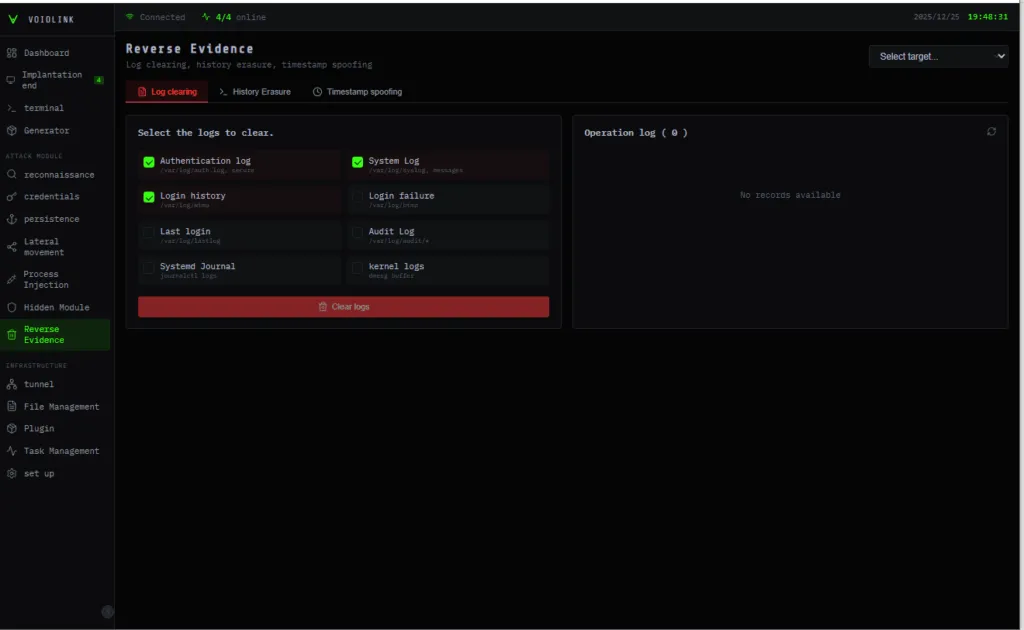反取证(Anti-forensic)模块确保 VoidLink 留下的任何痕迹也被删除。该恶意软件会清理命令历史、登录记录、系统日志和丢弃的文件,同时确保文件不仅从文件系统中解除链接,还用随机数据覆盖,以防止取证恢复。