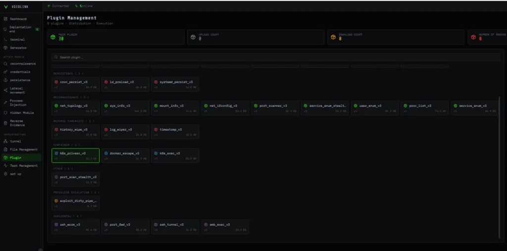 VoidLink 的功能集异常广泛。它包括类似rootkit的功能(LD_PRELOAD、LKM和eBPF)、一个用于扩展功能的内存插件系统,以及基于检测到的安全产品来调整运行时规避策略的自适应隐身机制——在受监控环境中更看重操作安全而非性能。它还支持多种命令与控制通道,包括HTTP/HTTPS、ICMP和DNS隧道,并能在受感染主机之间形成P2P/网状通信。在最新样本中,大多数组件似乎已接近完成,同时还有一个功能性的C2服务器和一个集成到单一生态系统中的仪表板前端。