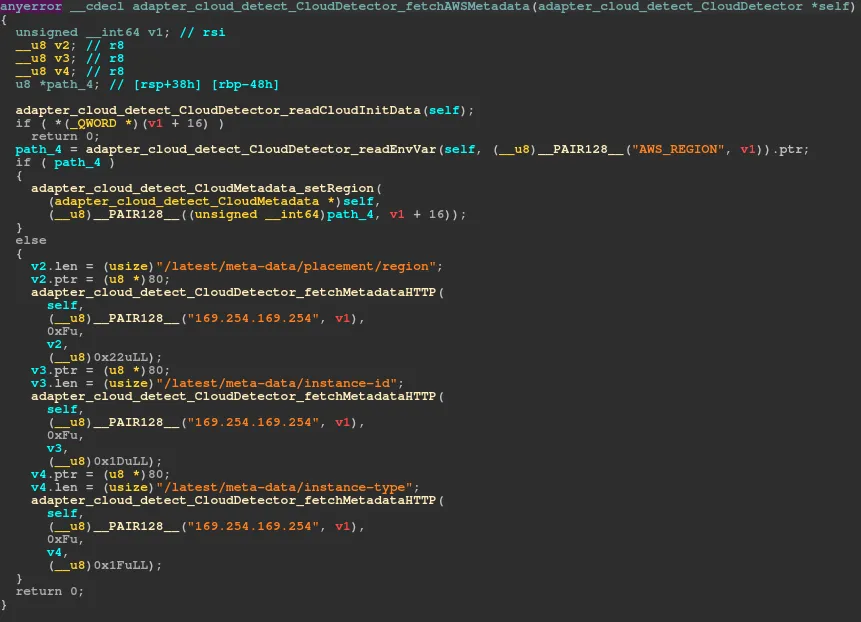 图 7 – 查询 AWS 元数据除了云检测,它还会收集关于受感染机器的大量信息,枚举其虚拟机管理程序,并检测其是否运行在 Docker 容器或 Kubernetes Pod 中。