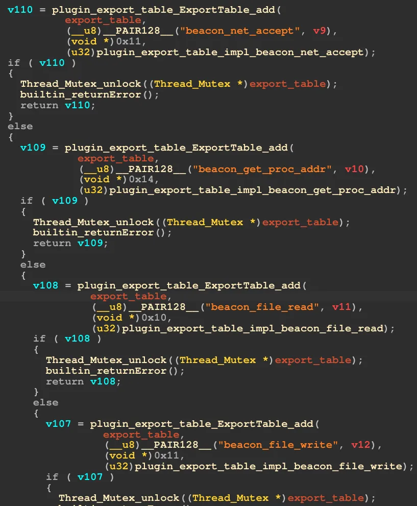 除了核心模块和命令外,VoidLink 框架还提供了一个广泛的开发 API,类似于(并且很可能借鉴了)Cobalt Strike 及其 Beacon API。该 API 在恶意软件初始化期间通过创建一个包含所有可用 API 的导出表来设置。