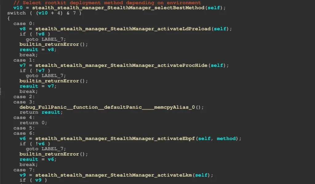 一个隐身模块集成了先进的隐藏技术,包括内核级技术。它维护着一系列针对多个内核版本定制的 rootkits。它将它们与 eBPF 程序结合,这些程序可以在更新的、锁定安全的系统上 hook 敏感路径,而无需传统的 LKM。VoidLink 再次根据其运行的环境来处理 rootkit 部署,并相应选择合适的 rootkit。根据内核版本和支持的功能,将选择以下 rootkit: