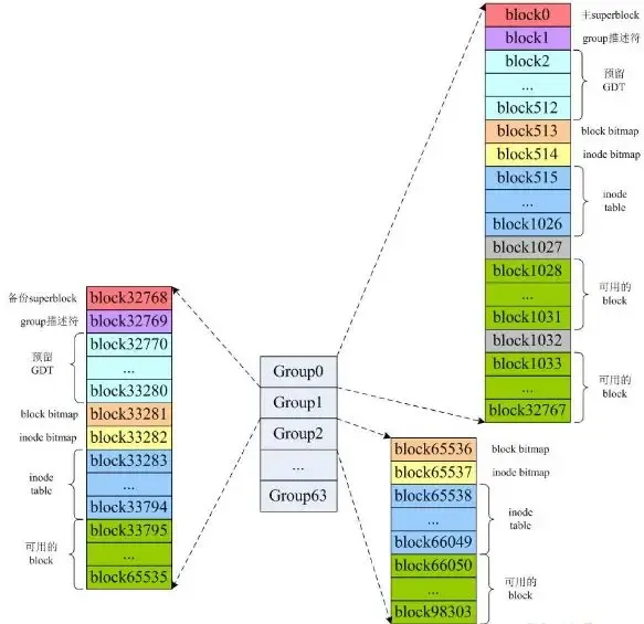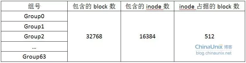 这个示例中hdd1中一共包含1048576个inode节点(inode编号从1开始),每个inode节点大小为128字节,所有inode消耗的存储空间是1048576×128=128MB;总共包含2097065个block,每个block大小为4096字节,每32768个block组成一个group,所以一共有2097065/32768=63.99,即64个group(group编号从0开始,即Group0~Group63)。所以整个/dev/hdd1被划分成了64个group,详情如下: