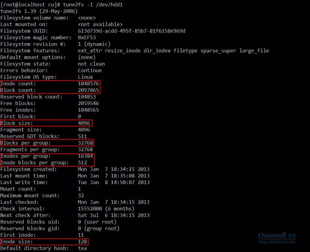 [root@localhost ~]# tune2fs -l /dev/sda1tune2fs 1.39 (29-May-2006)Filesystem volume name: /bootLast mounted on:Filesystem UUID: 6ade5e49-ddab-4bf1-9a45-a0a742995775Filesystem magic number: 0xEF53Filesystem revision #: 1 (dynamic)Filesystem features: has_journal ext_attr resize_inode dir_index filetype needs_recovery sparse_superDefault mount options: user_xattr aclFilesystem state: cleanErrors behavior: ContinueFilesystem OS type: LinuxInode count: 38152Block count: 152584Reserved block count: 7629Free blocks: 130852Free inodes: 38111First block: 1Block size: 1024Fragment size: 1024Reserved GDT blocks: 256Blocks per group: 8192Fragments per group: 8192Inodes per group: 2008Inode blocks per group: 251Filesystem created: Thu Dec 13 00:42:52 2012Last mount time: Tue Nov 20 10:35:28 2012Last write time: Tue Nov 20 10:35:28 2012Mount count: 12Maximum mount count: -1Last checked: Thu Dec 13 00:42:52 2012Check interval: 0 ()Reserved blocks uid: 0 (user root)Reserved blocks gid: 0 (group root)First inode: 11Inode size: 128Journal inode: 8Default directory hash: teaDirectory Hash Seed: 72070587-1b60-42de-bd8b-a7b7eb7cbe63Journal backup: inode blocks该命令已经暴露了文件系统的很多信息,接下我们将详细分析它们。