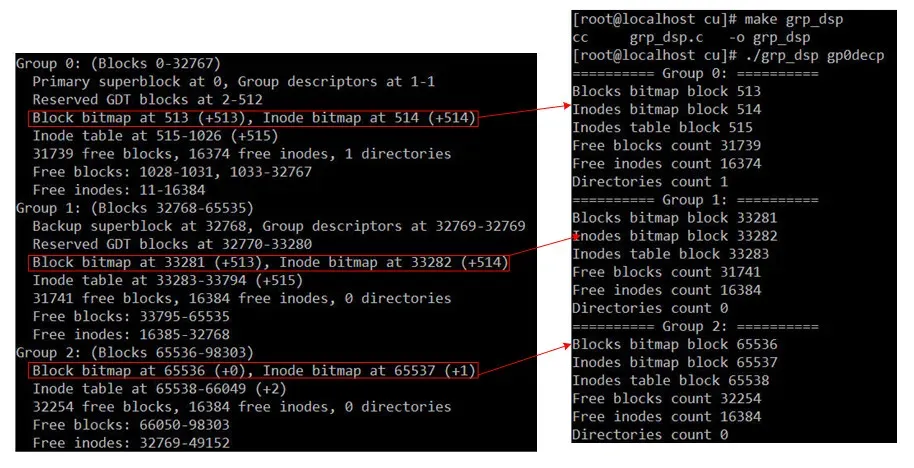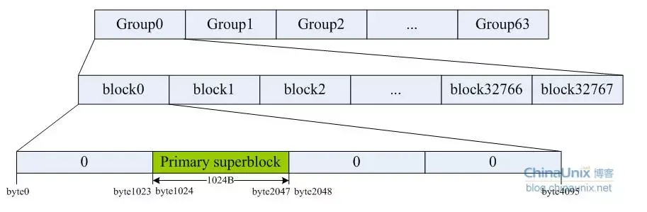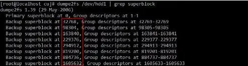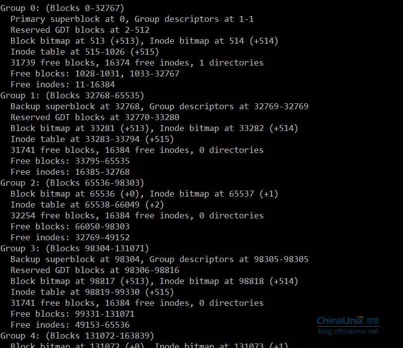 用block号分别除以32768就得到了备份superblock的Group号,和我们在上面看到的结果一致。我们来看一下/dev/hdd1中Group和block的关系: