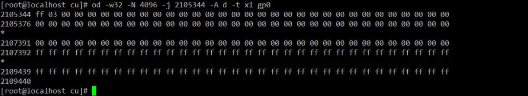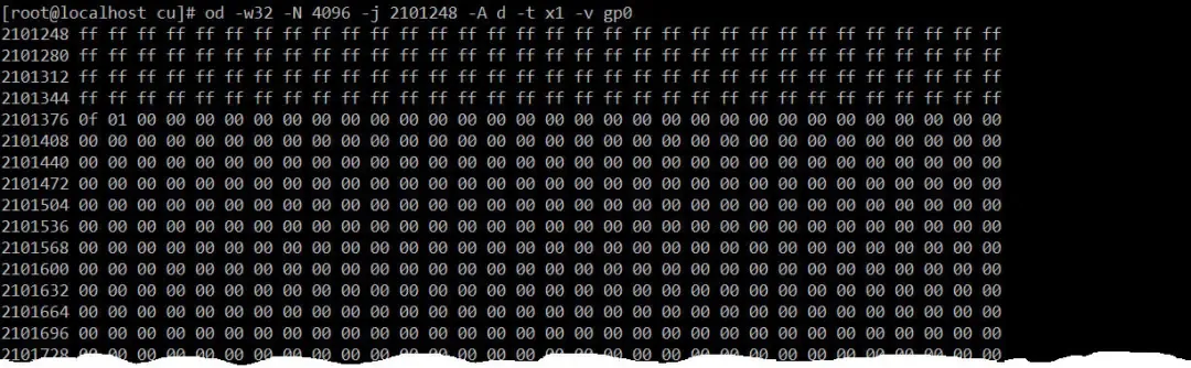 发现block bitmap的前128字节和第129字节的低4位都为1,说明发现Group0中前128×8+4=1028个block,即block0block1027都已被使用了。第129字节的高4位为0,表示block1028block1031四个block是空闲的;第130字节的最低位是1,说明block1032被占用了;从block1033~block32767的block bitmap都是0,所以这些block都是空闲的,和上表输出的结果一致。