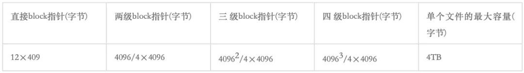 一个block为4096字节,每个块指针4字节,所以一个block里最多可以容纳4096/4=1024个block指针,我们可以计算出一个inode最大能表示的单个文件的最大容量如下: