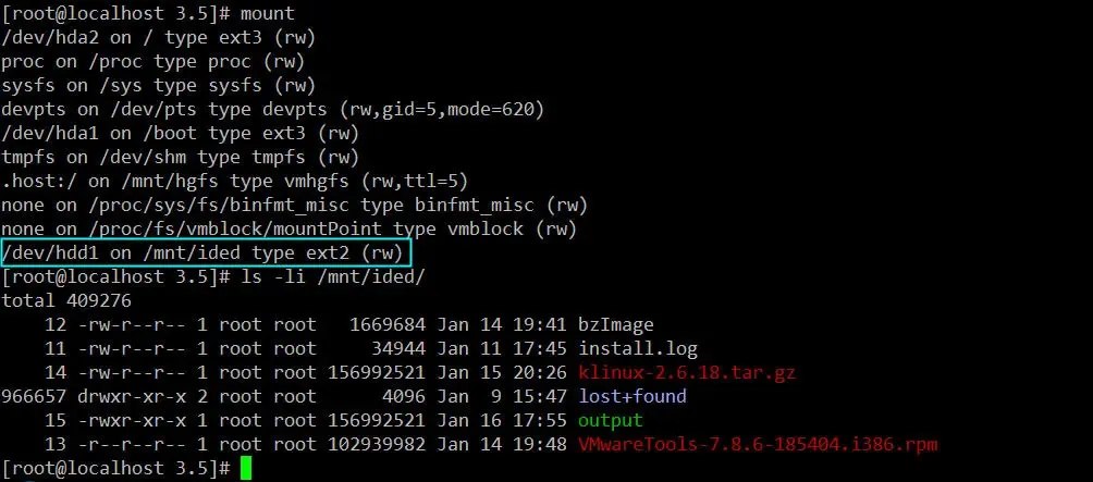 我的一块虚拟硬盘/dev/hdd1只有一个分区,格式是ext2挂载在/mnt/ided目录下。该分区里有几个文件,如下所示。