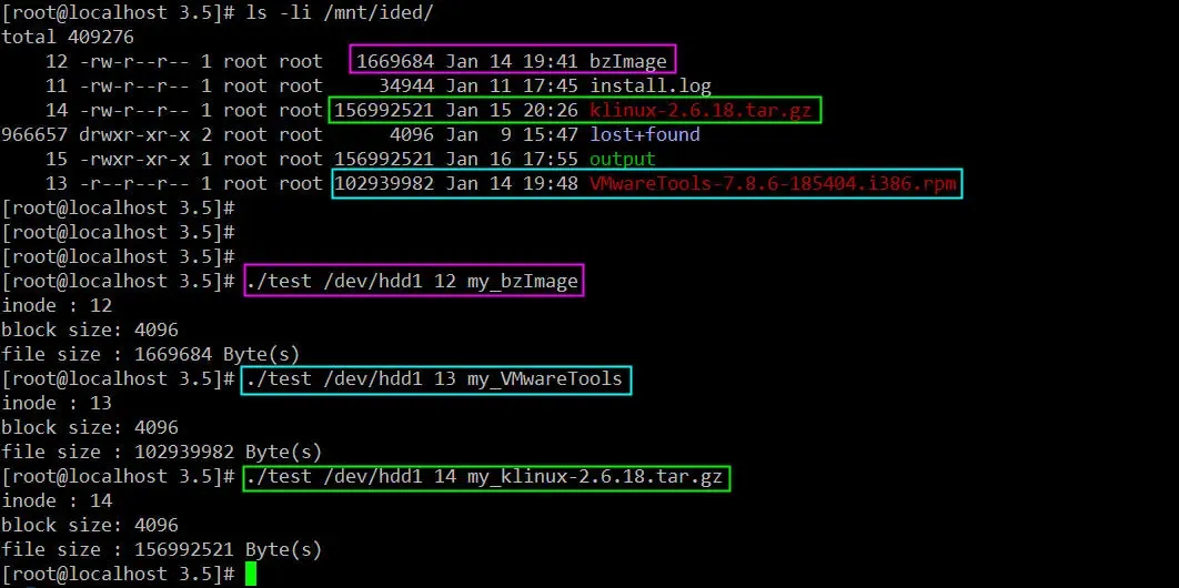 根据文件的inode号分别读取/mnt/ided目录下的bzImage(大小bzImage字节),klinux-2.6.18.tar.gz(大小156992521字节)和VMwareTools-7.8.6-185404.i386.rpm(大小102939982字节)的内容。验证一下我们读取到的文件内容是否正确: