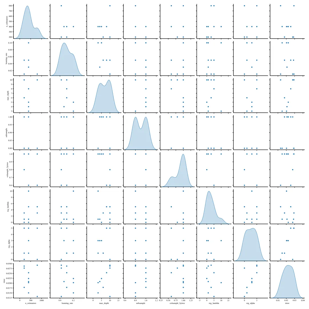 该图为超参数的成对散点矩阵图,展示不同超参数之间的分布特征与潜在关系,对角线上为各参数的概率密度分布,可用于分析参数空间结构与抽样多样性。
