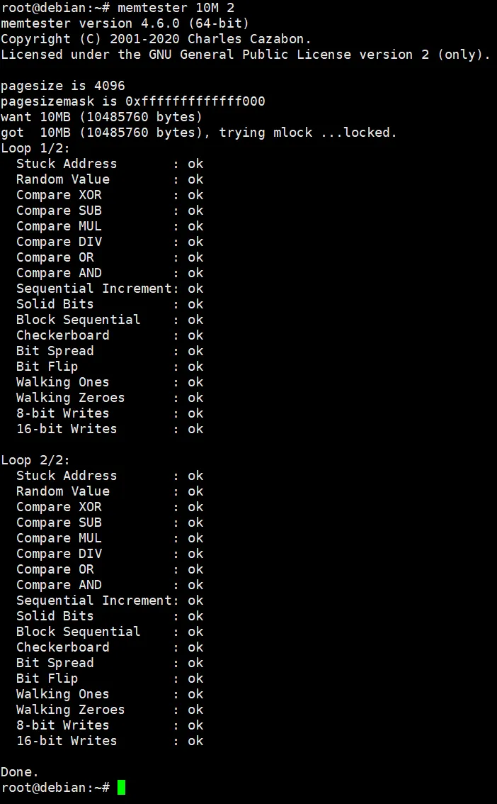 我这里实测命令秒级完成,会显示类似“1048576+0 records in 1048576+0 records out 4294967296 bytes (4.3 GB, 4.0 GiB) copied, 1.14088 s, 3.8 GB/s”的信息,说明内存基础读写正常;如果执行过程中出现“error writing”“permission denied”(排除权限问题后)等错误,直接判定为不良条,砸回给采购部。方法2:memtester精准检测,方法1的dd只能做初筛,想更精准检测内存颗粒、位翻转等问题,就要上memtester工具,它可以专门针对内存稳定性测试,操作简单,输出直观,实乃居家旅行必备良药。# 安装memtester(以Debian系统为例):apt-get update && apt-get install memtester # 执行测试:memtester 10M 2