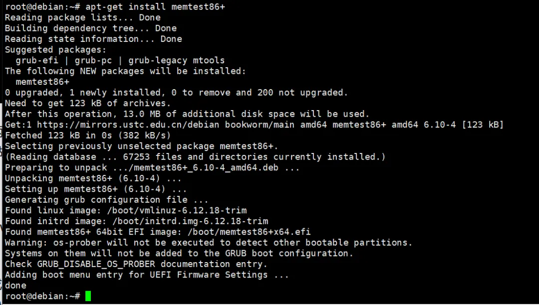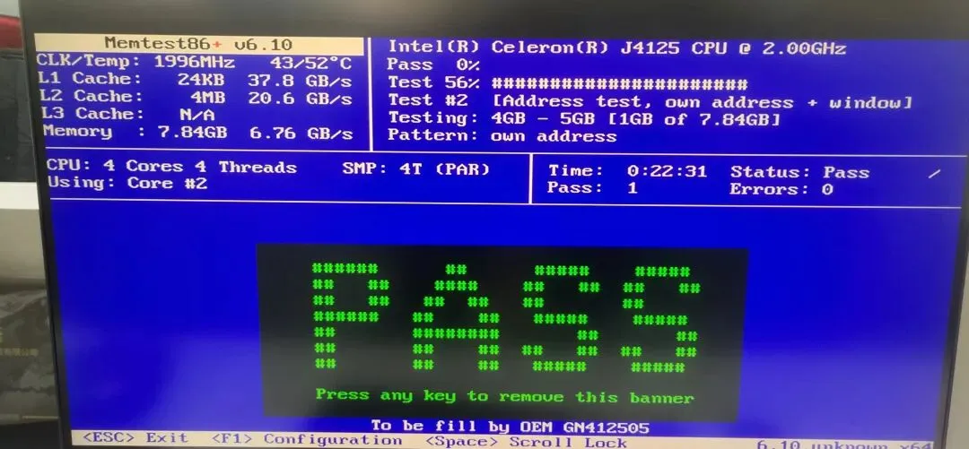 测试过程中如果全程显示ok,没有任何FAIL、error提示,说明内存稳定。如果出现一次“FAIL”,直接判定为不良条,比如显示“FAILURE: 0x00000000 != 0x00000001 at offset 0x139ba4e00”,代表该内存地址存在位翻转问题,无法正常使用。方法3:MemTest86+终极验证,如果前两种方法测试正常,且有时间(想摸鱼的),那就用专业的MemTest86+做离线测试。apt-get install memtest86+