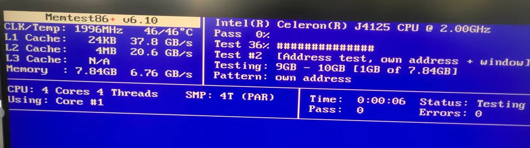 可以看到,安装的最后它提示:正在为UEFI固件设置添加启动菜单项...这玩意需要重启系统用它添加的启动项进入测试,是不是瞬间觉得高大上了?二话不说,直接重启,反正是测试环境,不用担心被迫提桶跑路。重启后发现启动菜单多了这两项玩意,选择前面那个即可,后面那个什么串口什么的,不太懂,估计是远程调试用的?懂的大佬来指导下。然后它就开始测试了,手机拍的,将就看,不要问什么手机,问就是诺基亚!要说创作不容易,大佬你看我这足足花了20多分钟才测试完1轮:默认是无限测试的,不会自己停的,但我们只需要测试1轮,大概就能测出有没有问题了,测试完一轮后,会显示测试结果,有ERROR就不会显示PASS了:结合上面3种测试方法,基本可以证明我这内存条完全正常。再啰嗦一句,创作不易,我这都是实打实操作一次的,如果觉得这些方法实用,记得点赞并转发给身边的运维同(niu)行(ma)~