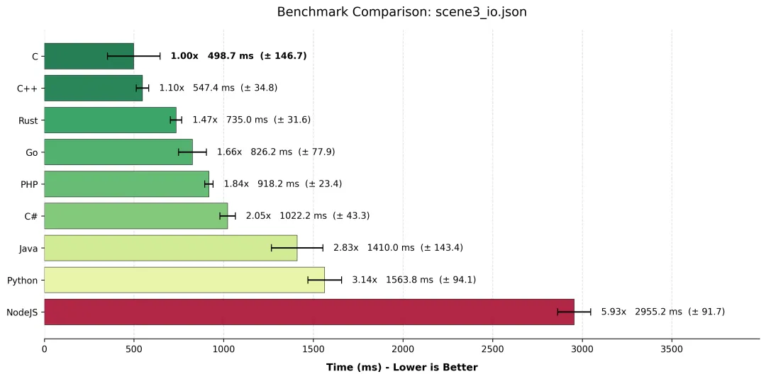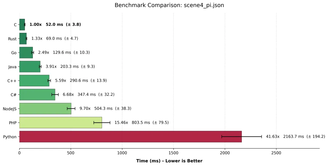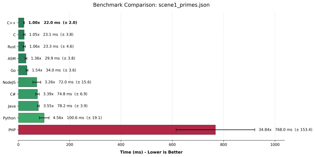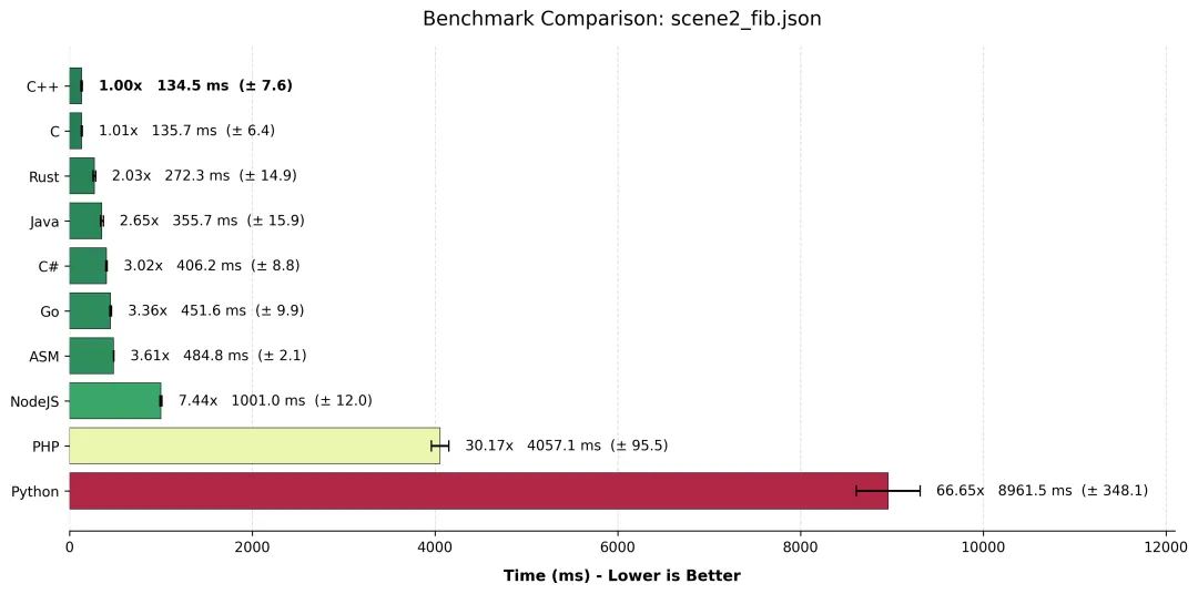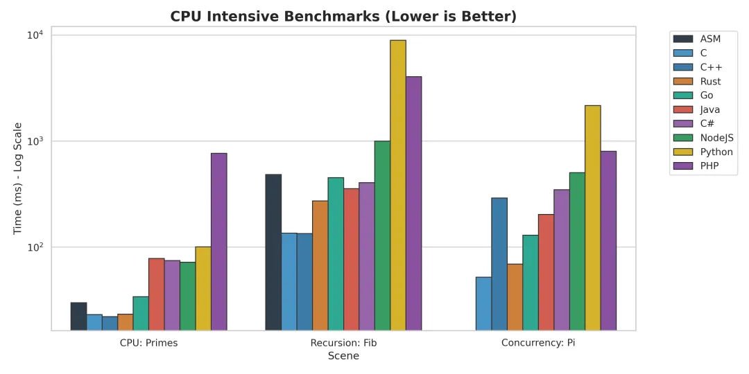Node.js / PHP / Python这里的差距是断崖式的。Node.js 尚能看到前面的车尾灯,而 Python 在纯计算领域,基本上是在用“地质年代”来计时的。