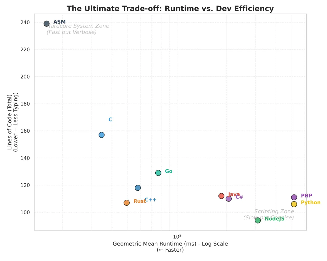C / C++ / Rust / ASM这四位选手基本住在 X 轴的零点附近。它们之间的差距在毫秒级,胜负往往取决于编译器当天的心情(内联策略)或者你是否多写了一个 const。 - • T1 梯队 (凡人巅峰):