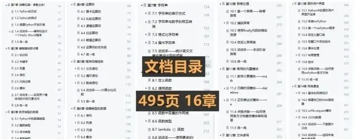 总共495页,其中包含数据类型的数据、运算符、程序流程控制、字符串、函数、文件读写和多线程等内容,任何人都可以阅读和学习,建议拿过去学习一下!以下是这份资料的部分内容截图展示。