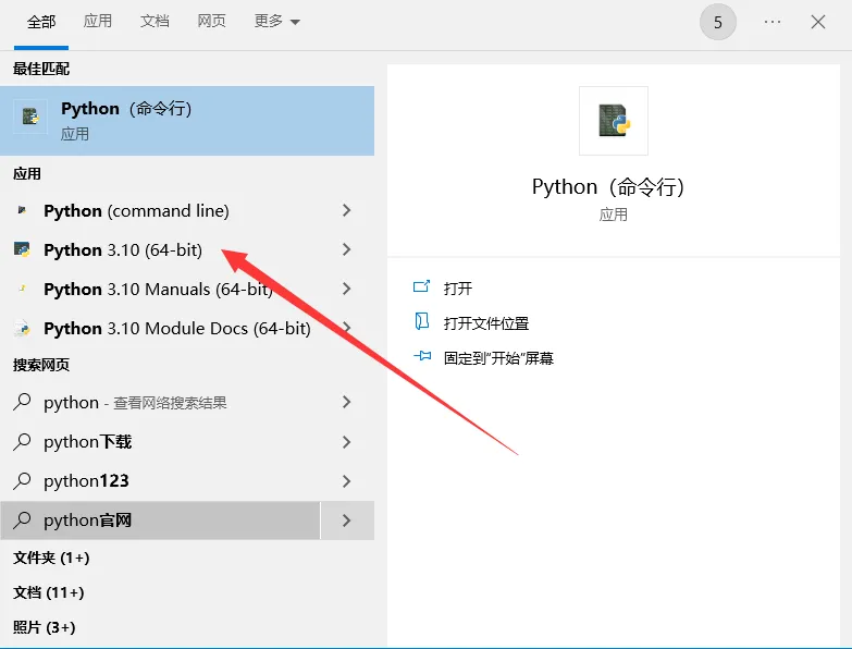 点击键盘的Windows键,输入"python",鼠标点击Python 3.10