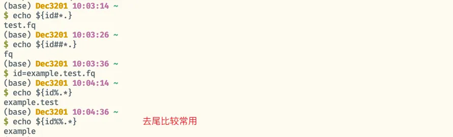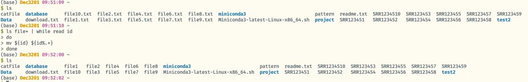 ## 结构for i in *list*do*commands*done## 实例:生成十个文件夹for i in {1..10} ##变量要加{},否则容易分辨不出变量。dotouch file${i}done##实例:将上面的十个文件夹都加上txt后缀for i in (ls file*) ##()可以替换为反引号``domv ${i}${i}.txtdone## 结构while *read id*do*commands*done##实例:将上面的十个文件夹都加上txt后缀ls file* | whileread iddomv ${id}${id}.txtdone##实例:将上面的十个文件夹删除txt后缀ls file* | whileread iddomv ${id}${id%.txt}done作用:删除一些特定内容