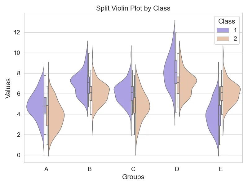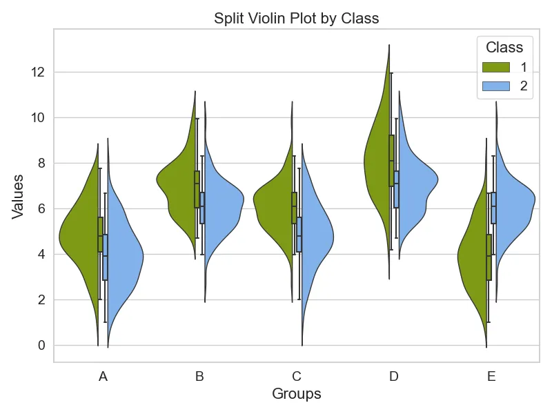 # 清理重复的图例 (因为叠加了两次图,图例会有重复)handles, labels = ax.get_legend_handles_labels()# 只保留前一半的图例 (即小提琴的图例)n_categories = len(df_melted['class'].unique())plt.legend(handles[:n_categories], labels[:n_categories], title='Class', fontsize=14, # 设置图例中标签文本(Class类别名)的大小 title_fontsize=16, # 设置图例标题('Class')的大小 loc='upper right' # 可选:固定图例位置 )# 设置标题和标签plt.title('Split Violin Plot by Class', fontsize=16)plt.xlabel('Groups', fontsize=16)plt.ylabel('Values', fontsize=16)# 1. 设置横轴(和纵轴)刻度字体的大小# axis='x' 仅修改横轴,labelsize 设置字号plt.tick_params(axis='x', labelsize=14)plt.tick_params(axis='y', labelsize=14)