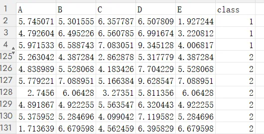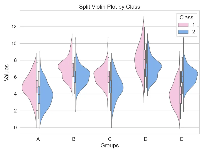 try: # 尝试读取 Excel 文件 df = pd.read_excel('data.xlsx', engine='openpyxl', sheet_name='Sheet1', header=0) print("成功读取 Excel 文件")except Exception as e: print(f"文件读取错误或文件不存在,使用图片中的示例数据: {e}")# 数据预处理:将宽格式转换为长格式 (Long Format) 以适应 Seaborn# id_vars 保留 'class',其他的列 (A, B, C, D, E) 融化为 'Variable' 和 'Value'df_melted = df.melt(id_vars='class', var_name='Group', value_name='Value')# 确保 class 列是分类变量,便于绘图图例显示df_melted['class'] = df_melted['class'].astype(str)# my_palette = ["#a596ee", "#f0c2a2"]# my_palette = ["#c8627a", "#5595d1"]my_palette = ["#fdc0e1", "#71b0fd"]# my_palette = ["#8ab001", "#71b0fd"]